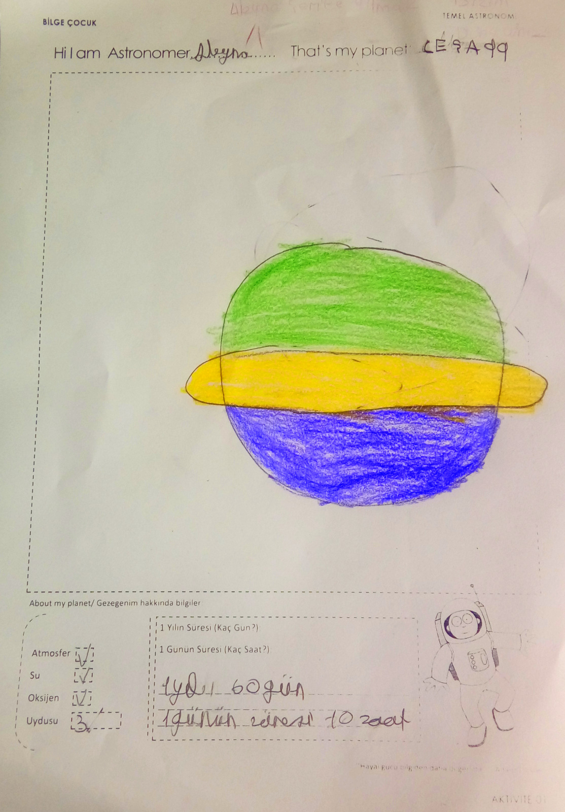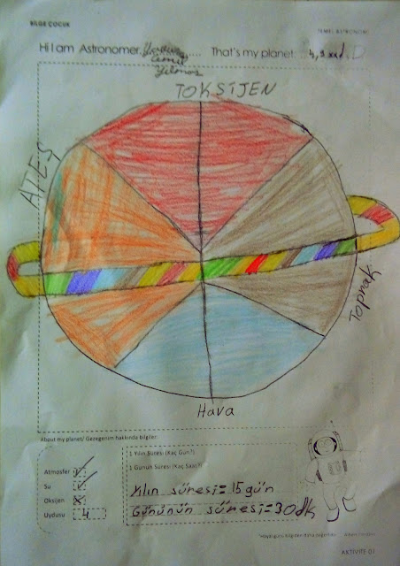 Bugün tamamı 10 yaşında, 4 farklı gruptaki çocuklarla Temel Astronomi dersi'nde Güneş Sistemi konusunu işledik. Zaten zaman zaman duydukları 8 gezegeni ve diğer sistem bileşenleri yakından tanıdılar. Hazır gezegenler hakkında bilgi edinmişken bir gezegen hayal etmelerini istedim. Bilimsel değerlere, gerçekliğe bağlı kalmadan tamamen kendilerinin düşlediği, 1 yılın süresinden uydu sayısına kadar her şeyi onların hayal ettiği bir gezegen... Ne çizdiklerini merak ediyorsanız;